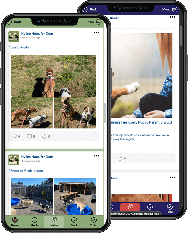 Our one-click photo sharing allows every employee to quickly upload, tag, and share pet photos. You can have those shared photos go directly to your customer or have a manager approve them easily before sharing with the customer! Then, clients automatically receive push notifications when they’re ready to view.