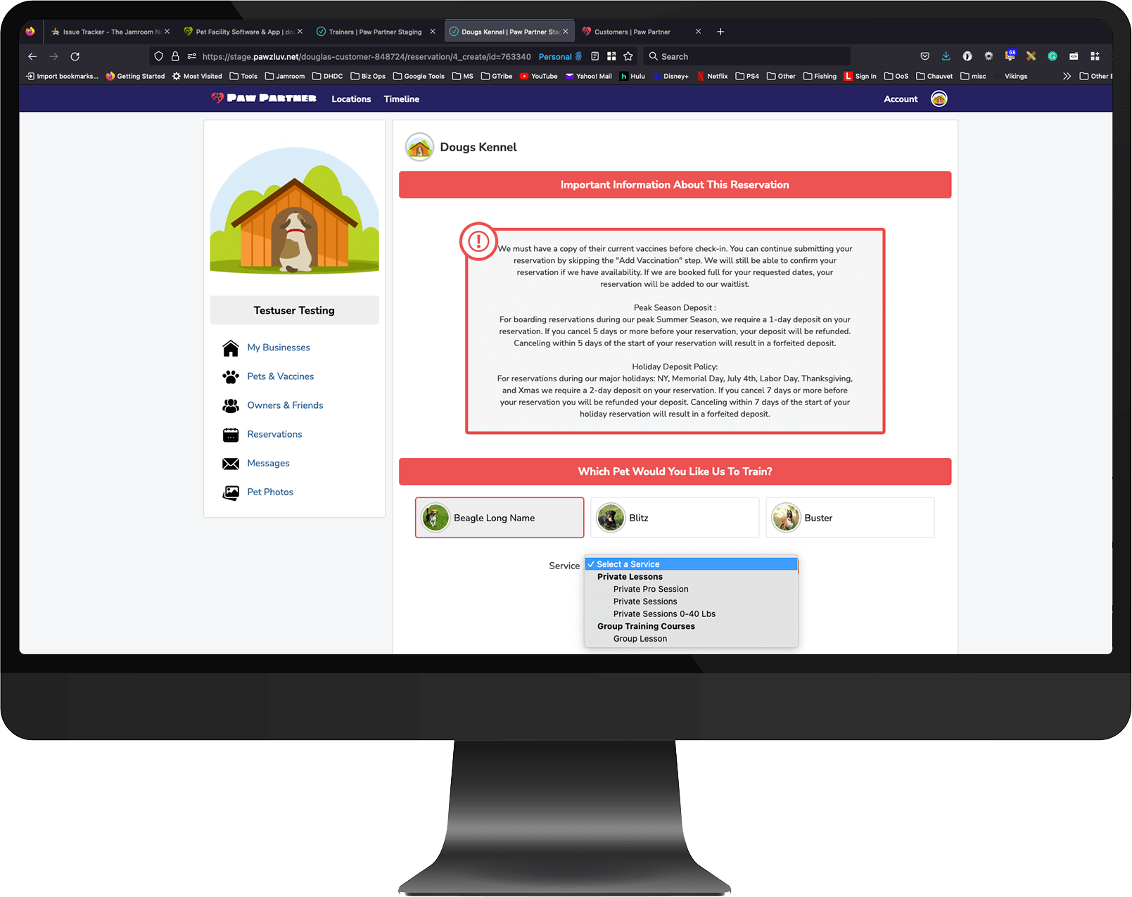 No more chasing down vaccines from the vet. Your clients can upload their dog’s vaccine records directly to their account, where you can view and approve them. Plus, clients receive a notification at 30 days, 7 days and 1 day before their vaccine expires.